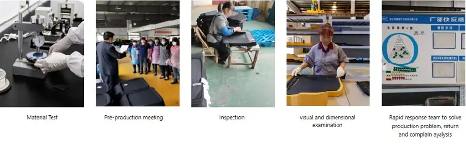 Vi är helt kompatibla med ISO9001 för design och tillverkning av bilmattor, ISO/TSI16949 för kvalitetskontroll, ISO14001:2015 för miljöledning, BSCI för socialt ansvar och EU REACH-standarder för råvaror. Vi har interna testanläggningar för att utföra självkontroller för att säkerställa att våra produkter klarar tester utförda av SGS, Intertek eller någon annan tredje parts inspektör som kunder kan behöva.