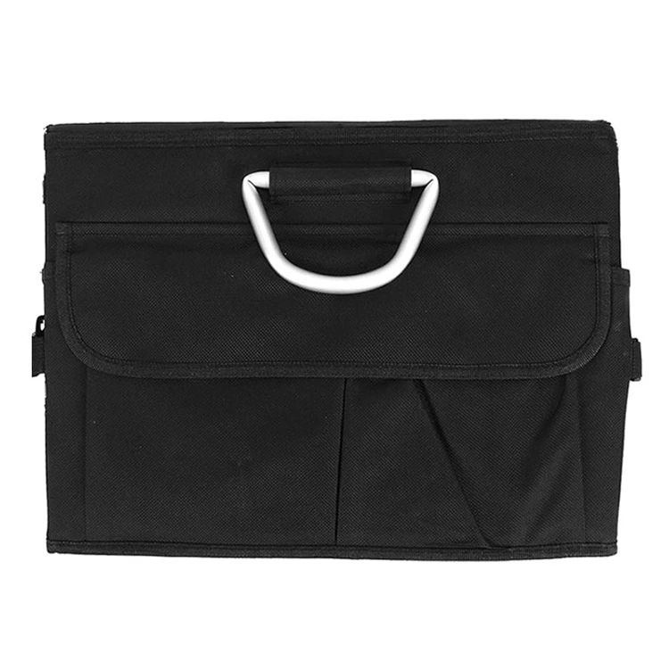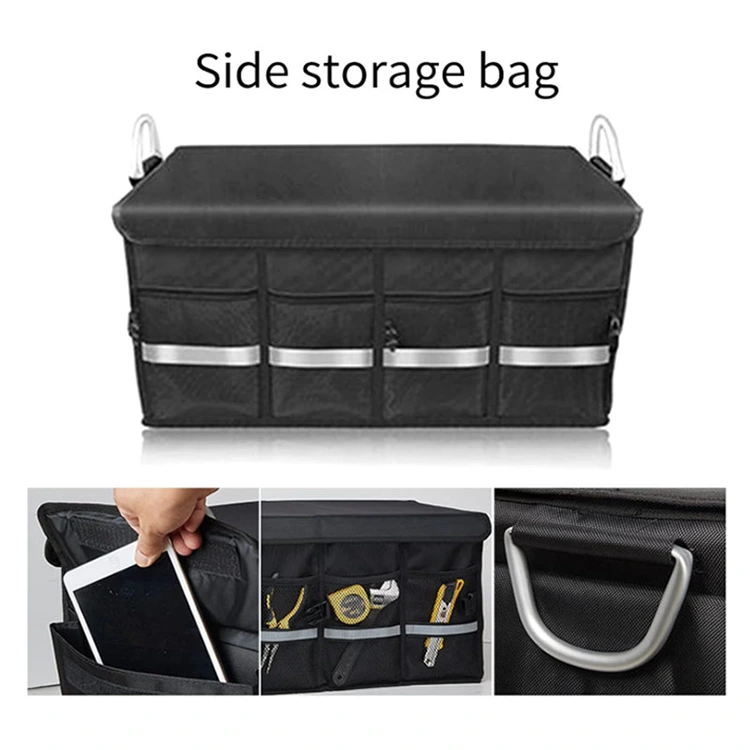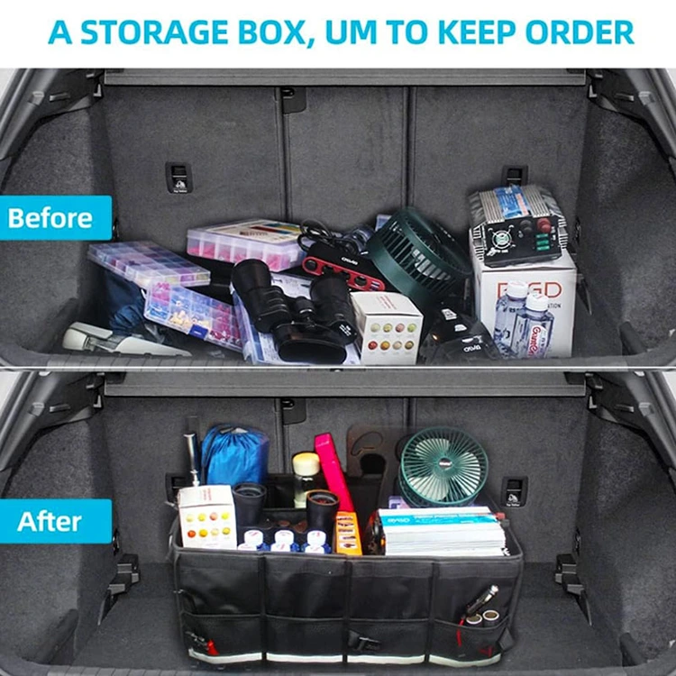 Tre huvudfack organiserar verktyg, mat, sportutrustning, städare och nödartiklar. Fyra sidofickor i mesh rymmer små saker som handdukar eller kort. En ficka med frontlock säkrar odds och slut. Den passar lastbilar, sedaner, stadsjeepar, skåpbilar och i stort sett alla fordon.