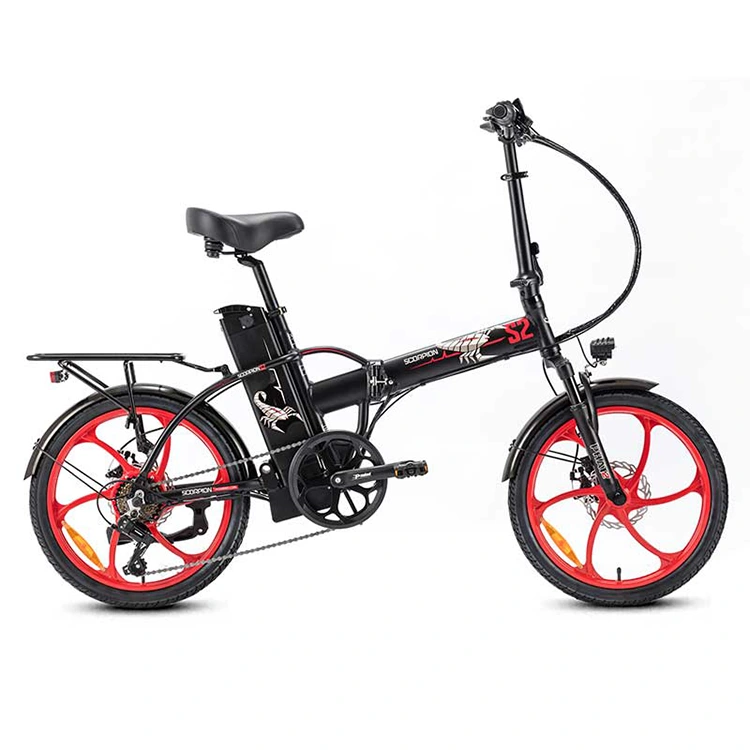 Elegant och kraftig hjuldesign: Den hopfällbara elcykeln har röda, femekrade lättmetallfälgar som har en djärv profil. Dessa hjul är för både stil och kraft, och har ett pålitligt skivbromssystem för ansträngning och säker bromsprestanda.