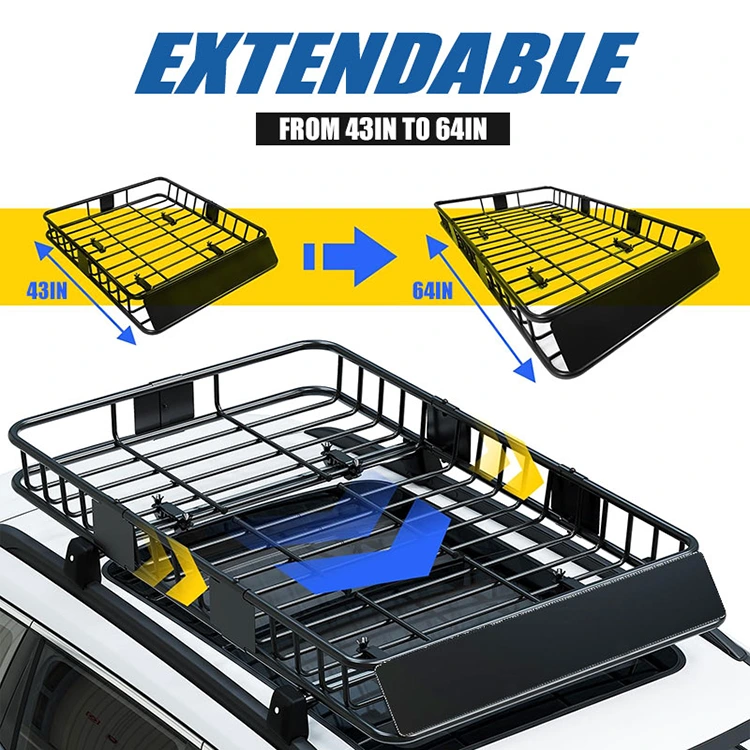 Utdragbar design: Denna bärkorg för takräcke har en smart utdragbar design – standardstorlek (43" x 39" x 6") för kompakta bilar och utbyggbar upp till 64" för större fordon, vilket maximerar lastutrymmet. Dess hopfällbara form gör den lätt att demontera, transportera och förvara när den inte används. Den är lämplig för flexibla resor och förvaringsbehov.
