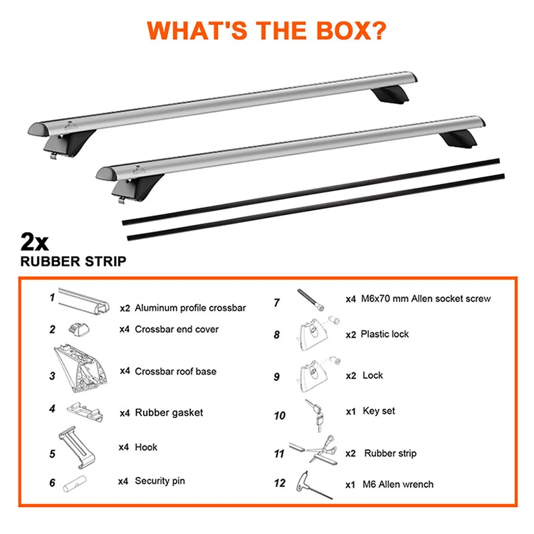 Dessa takräcken är konstruerade för fordon med plana sidoskenor och ger en robust plattform för att transportera bagage, cyklar eller campingutrustning. Den 14 kg lätta konstruktionen kombinerar korrosionsbeständig aluminiumlegering och slagtålig plast, vilket säkerställer hållbarhet. Tillbehör inkluderar 2 nycklar, en insexnyckel, en bruksanvisning och en PVC-remsa för snabb installation.