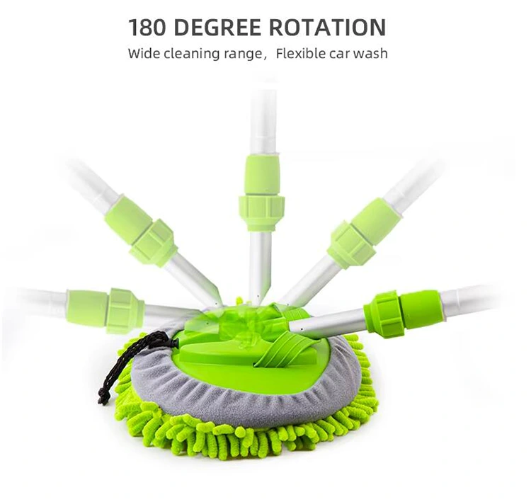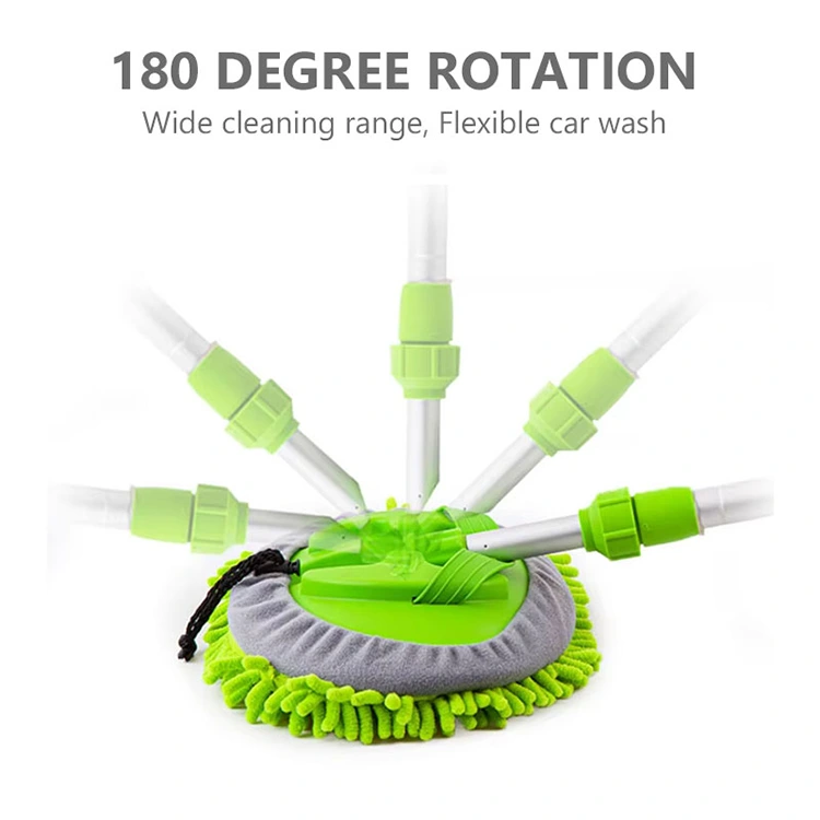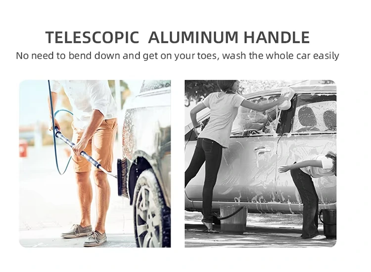 Den teleskopiska biltvättsmoppen, kallad Water Flow Brush, gör biltvätt enklare och effektivare. Det finns ingen anledning att böja sig eller bära en vattenhink – anslut en slang till toppen av handtaget så rinner vattnet direkt genom borsten. Det teleskopiska aluminiumhandtaget sträcker sig för att nå höga ytor och kan tas av helt för närbildsrengöring av bilytor och fönster. Handtaget roterar också 180 grader, vilket gör att du kan justera rengöringsvinkeln för bättre täckning och bekvämlighet.