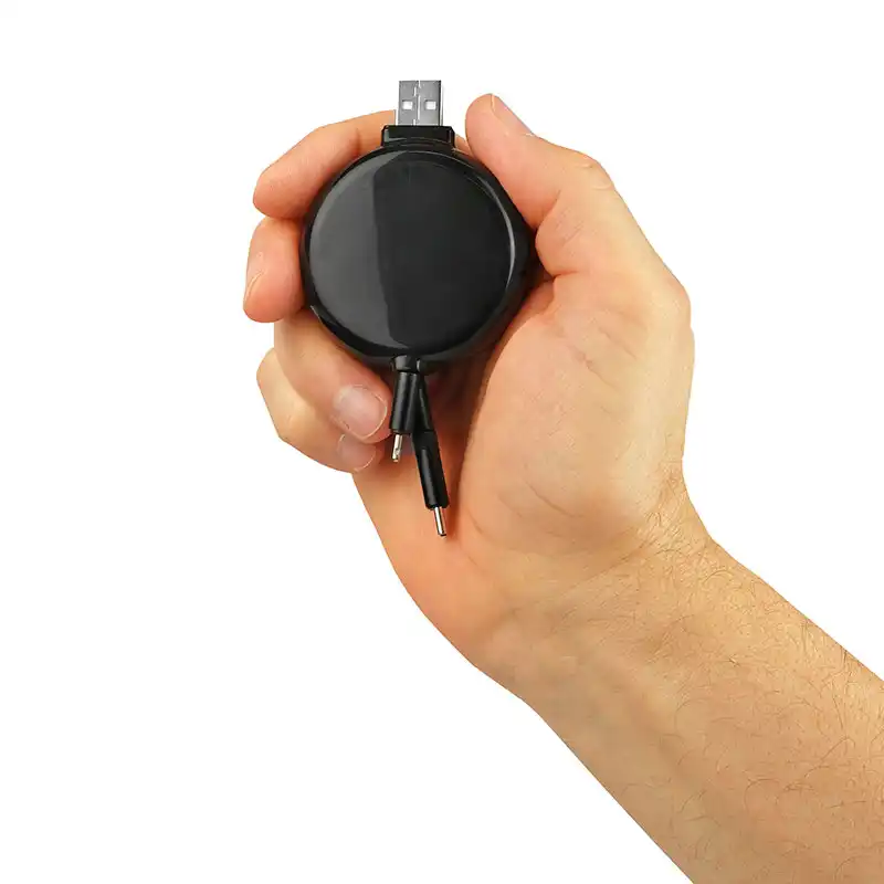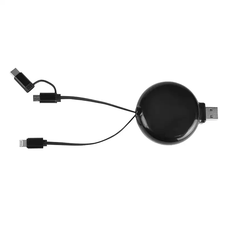 En mångsidig 3-i-1-lösning med integrerade Lightning-, Micro-USB- och USB-C-kontakter på en enda infällbar rulle för maximal kompatibilitet.